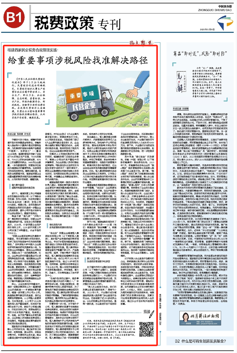 宁德时代动力电池、福耀汽车玻璃市场占有率稳居全球首位,安踏体育入选全球十大最具价值运动服饰品牌,九牧集团的智能马桶等产品稳居“中国第一、世界前三”……截至2024年底,福建民营经济贡献了全省近70%的地区生产总值、70.6%的税收、70%以上的科技创新成果、80%以上的城镇劳动就业、94%的企业数量。一系列数据表明,民营经济已经成为福建经济的重要特色,也是其活力所在和优势所在。值得注意的是,在税务合规管理方面,福建省民营企业注重给重要事项涉税风险找准解决路径,从而实现平安经营、健康发展。