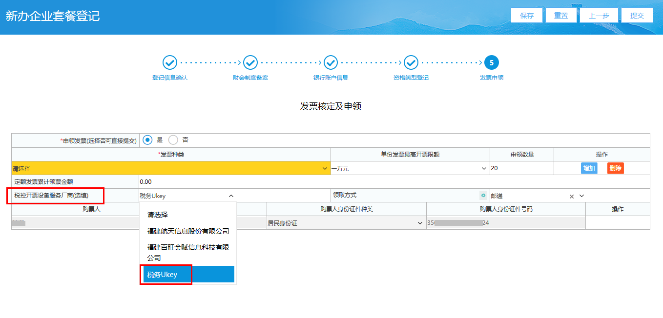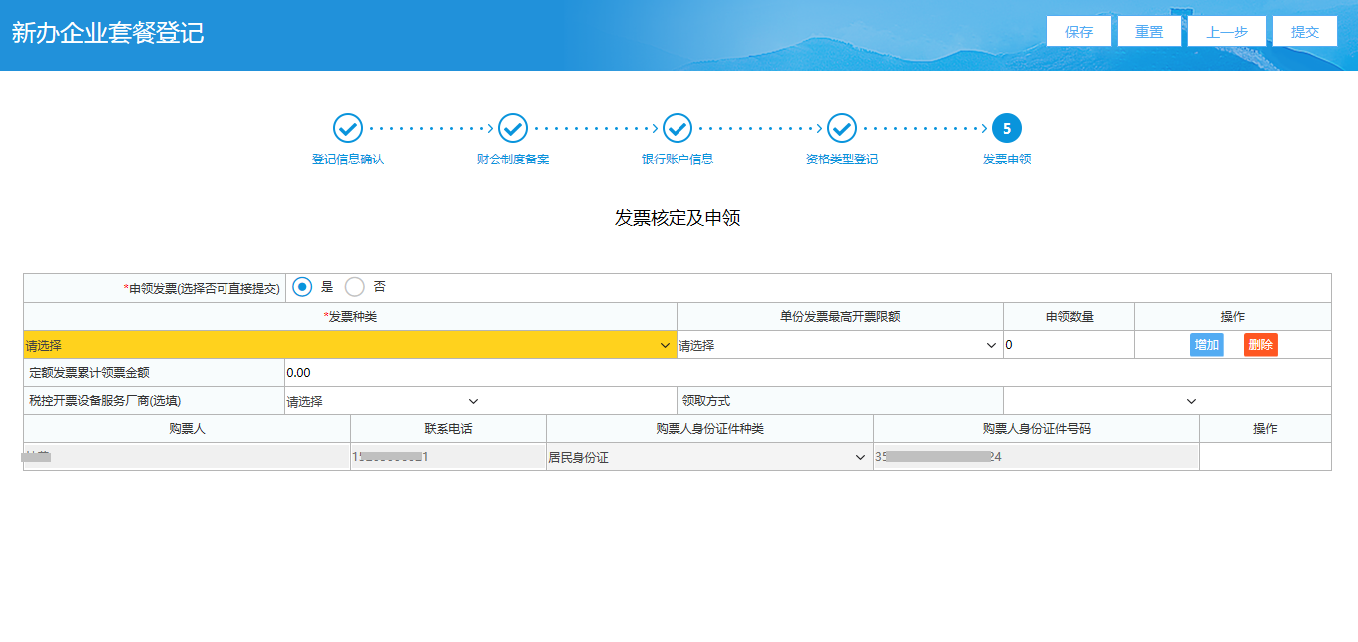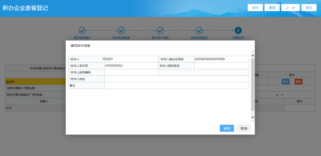 4.填写完成后点击“保存”返回发票申领界面,点击右上角“提交”完成新办企业套餐申请。
